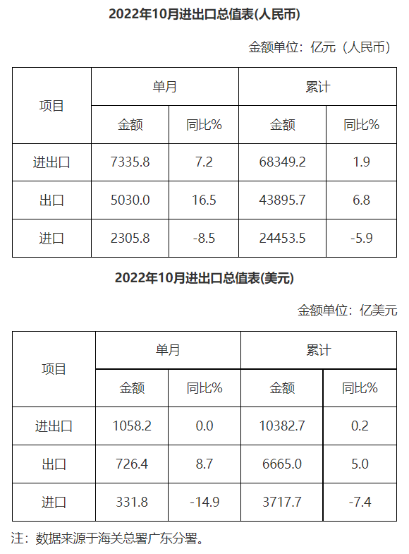 廣東省外貿(mào)進(jìn)出口總值表(2022年10月)