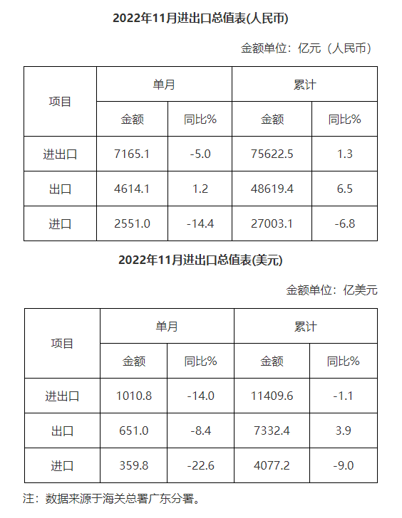 廣東省外貿(mào)進出口總值表(2022年11月)