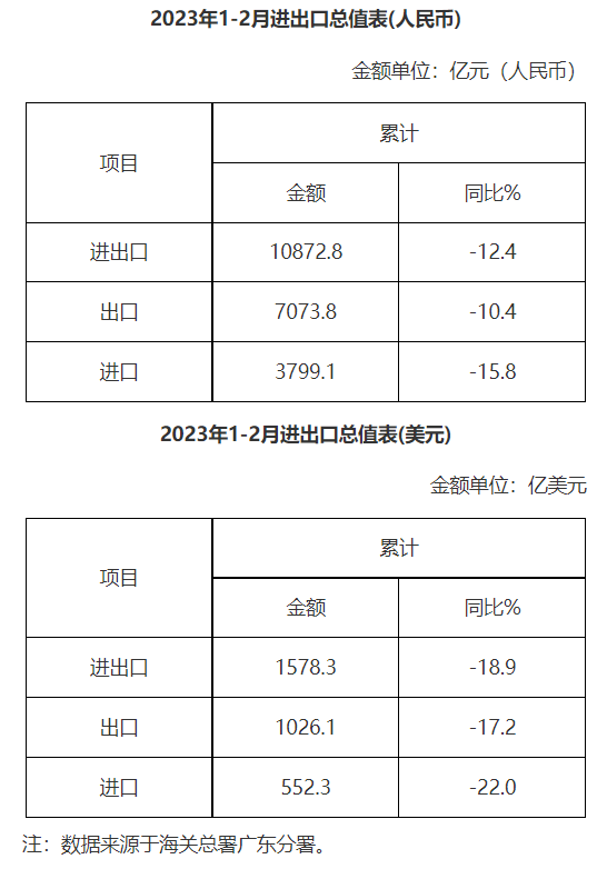 廣東省外貿(mào)進出口總值表(2023年1-2月)