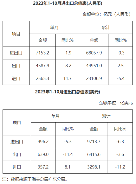 廣東省外貿(mào)進(jìn)出口總值表(2023年1-10月)