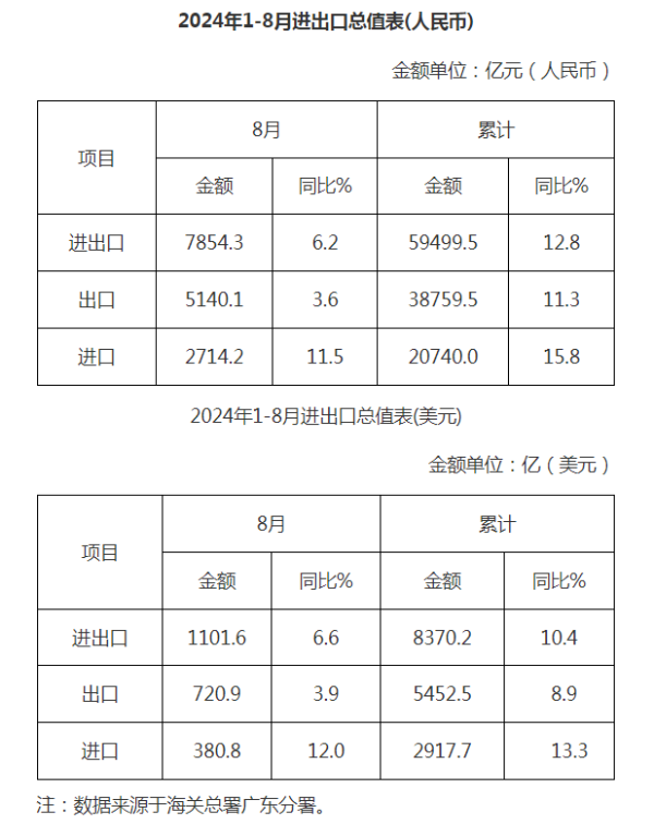 廣東省外貿(mào)進(jìn)出口總值表(2024年1-8月)