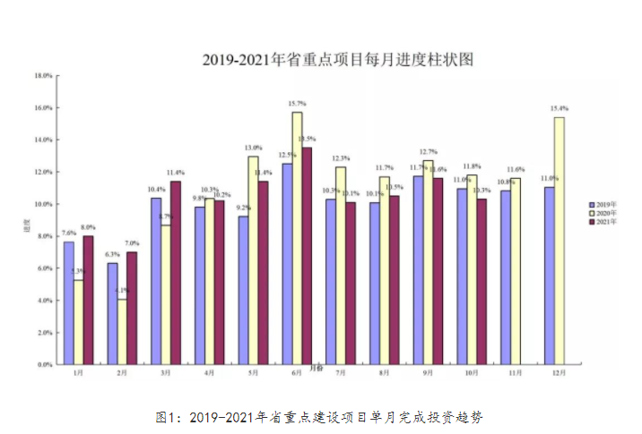 2021年安排省重點(diǎn)建設(shè)項(xiàng)目1395個,年度計(jì)劃投資8000億元。1-10月,全省重點(diǎn)項(xiàng)目完成投資約8317億元,為年度計(jì)劃投資的104%,比2020年同期低1.5個百分點(diǎn),比2019年同期高5.1個百分點(diǎn)。