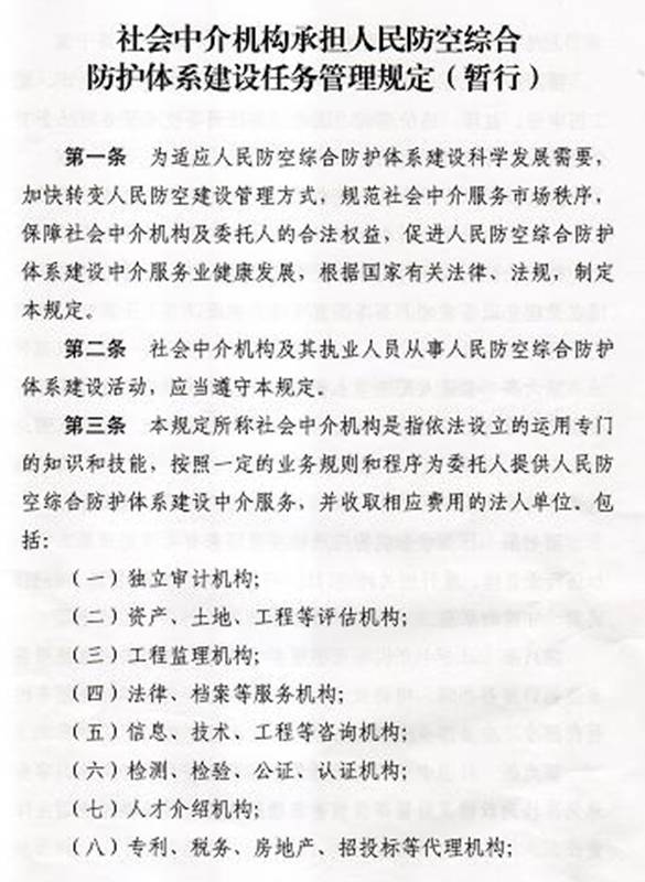 社會中介機構(gòu)承擔人民防空綜合防護體系建設(shè)任務管理規(guī)定(暫行)