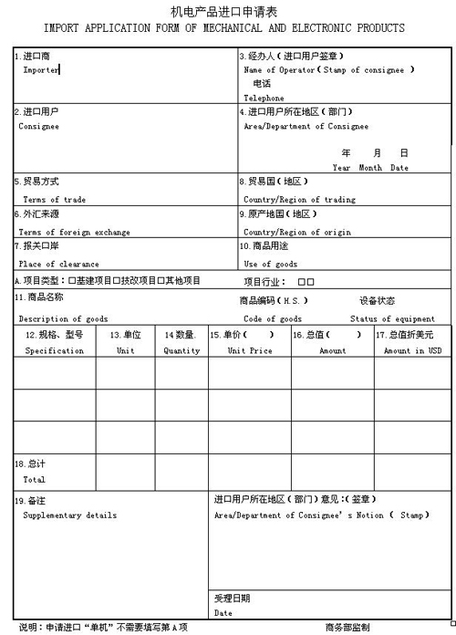 ?。ㄒ唬C(jī)電產(chǎn)品進(jìn)口申請(qǐng)表(見(jiàn)附件1);