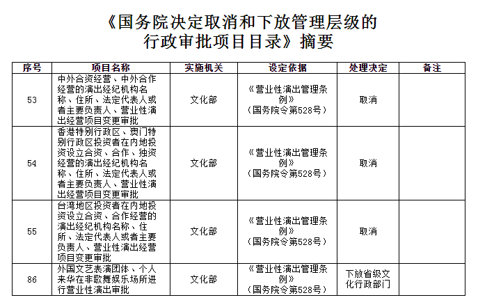 外國文藝表演團體、個人來華在非歌舞娛樂場所進行營業(yè)性演出的審批,下放至省級文化主管部門。