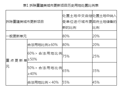 3.對(duì)于拆除重建類項(xiàng)目,政府將處置土地的一定比例交由繼受單位進(jìn)行城市更新,其余部分納入政府土地儲(chǔ)備,具體比例見(jiàn)表1。在交由繼受單位進(jìn)行城市更新的土地中,應(yīng)當(dāng)按照《辦法》和《實(shí)施細(xì)則》要求將不少于15%的土地?zé)o償移交給政府納入土地儲(chǔ)備。前述儲(chǔ)備土地優(yōu)先用于建設(shè)城市基礎(chǔ)設(shè)施、公共服務(wù)設(shè)施、城市公共利益項(xiàng)目等。